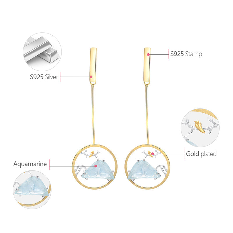 The focal point of each piece is the carefully carved section of light blue aquamarine gemstone that has been shaped to resemble the face of a mountain. This picturesque scene is completed in the form of a golden bird which rests on a silver branch in the upper portion of the pendant and earrings. Each bird is made from 18ct gold plated silver.