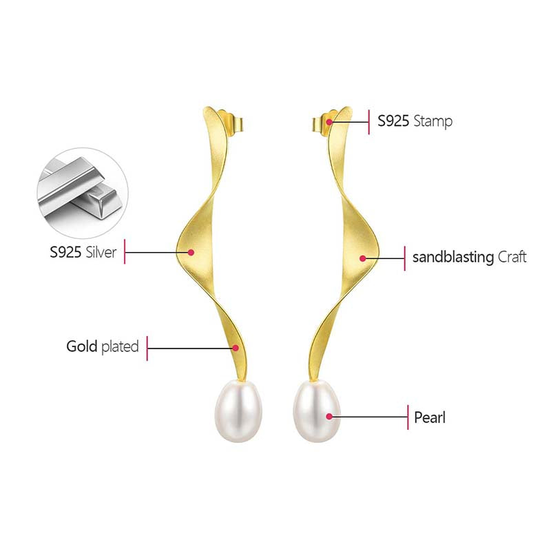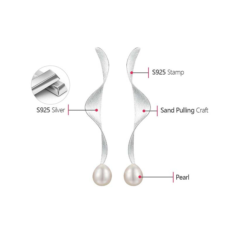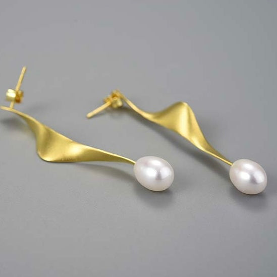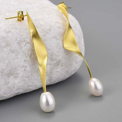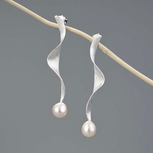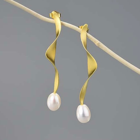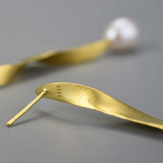 The earrings have a lovely twisted metal design attached to a pearl. The metal has a slight texture, giving it a soft matte look. A small chain connects to a pear-shaped natural pearl.